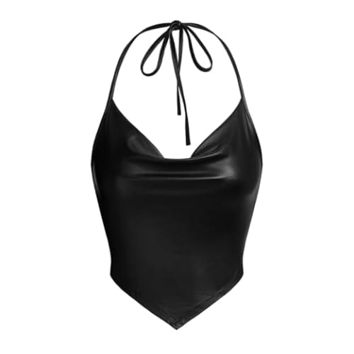OYOANGLE Women's PU Leather Sleeveless Draped Halter Crop Top